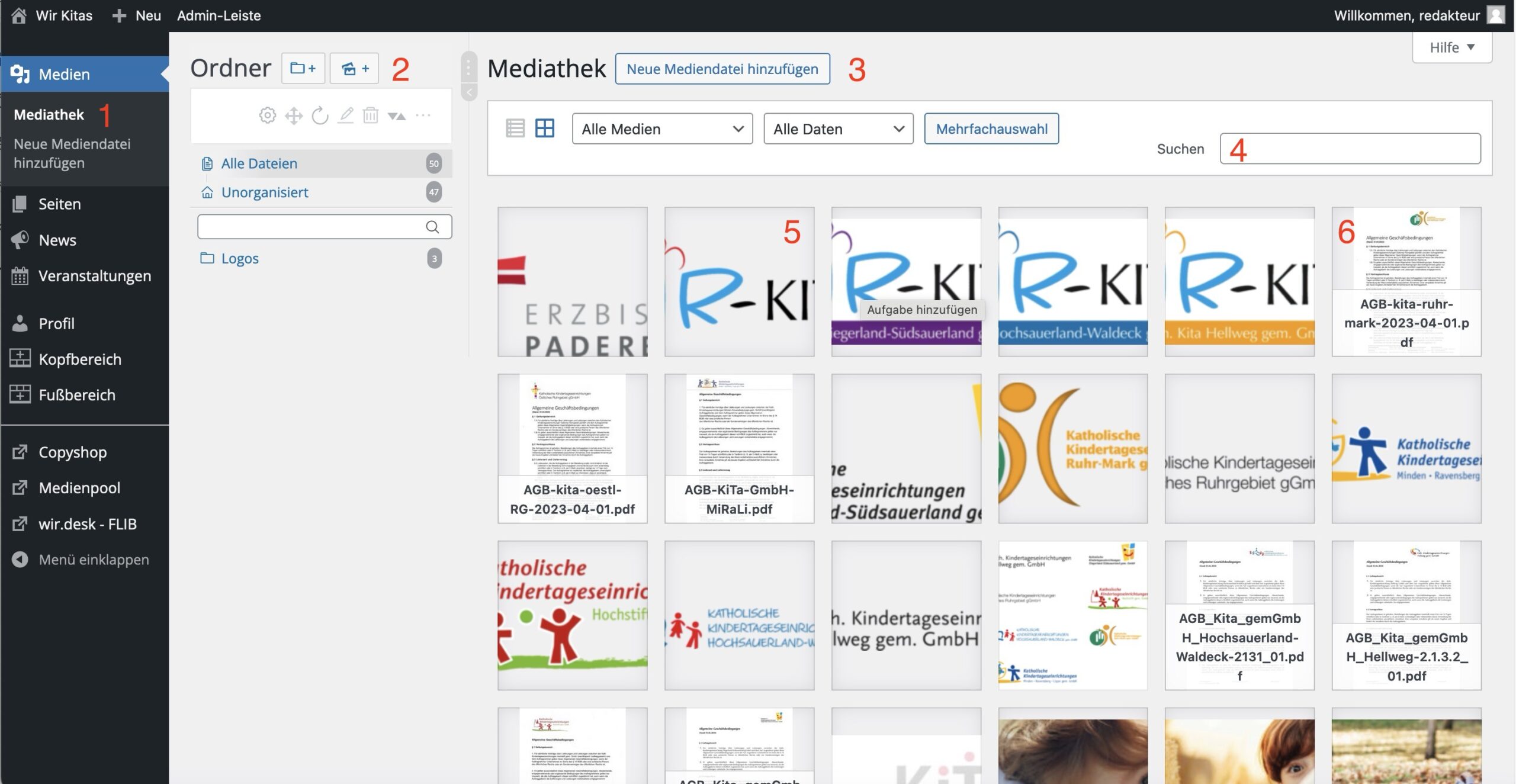 Die Mediathek dient zur Verwaltung aller Medien: Bilder, Videos, PDFs, Word-Dokumente.