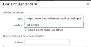 Dieses auswählen und bei PDFs oder externer Website den Haken setzen, damit sich das Dokument oder die Seite in einem neuen Tab öffnet.